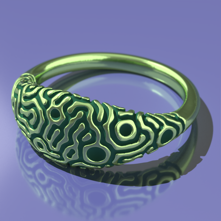 For each customer, a custom ring shape is created based on their preferences and finger size. The Reaction Diffusion algorithm is then applied to the surface. Because the algorithm uses different random seeds and design parameters each time it is run, no two rings are alike. The result is a striking piece with a unique pattern mimicking those found in many places in nature, from corals and fish skin to ferrofluids and convection patterns.