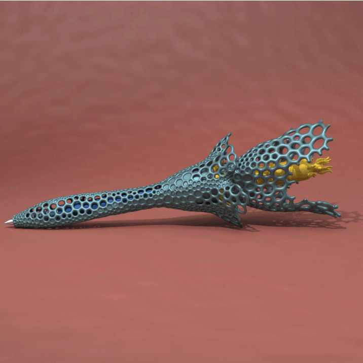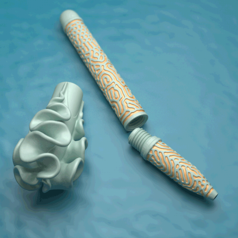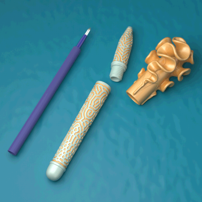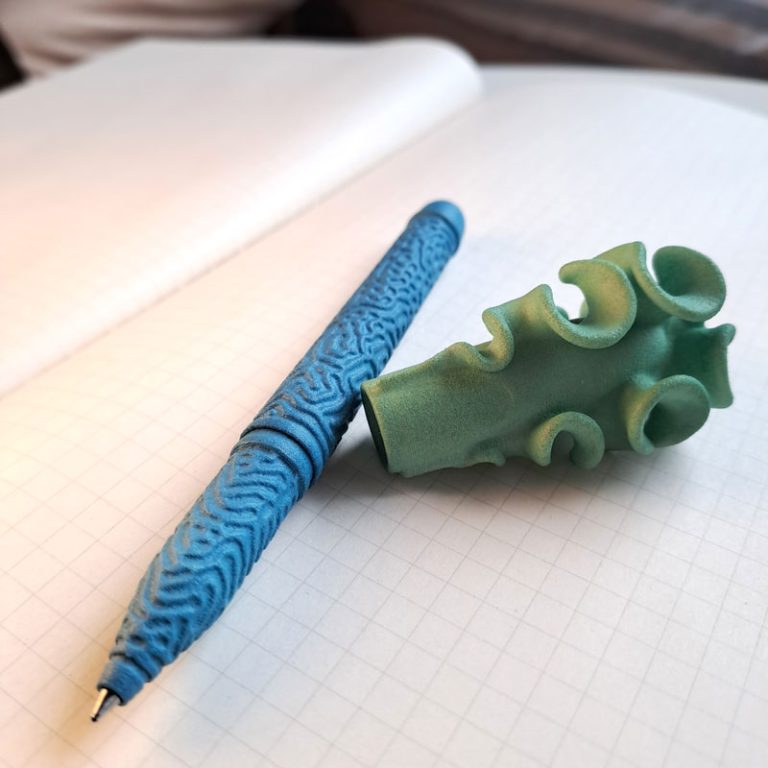 The pen comprises a click-on cap and 2 body pieces that enclose the pen cartridge. The body pieces screw together via a 3d-printed thread and feature embossed Differential Growth patterns, for visual interest and added grip. The cap features frills created with a differential growth algorithm. These create volume and grippy surfaces and also stop the pen from rolling when placed on a flat surface.  The printed nylon parts were dyed different colours, for added sea-creature resemblance.
