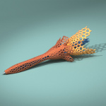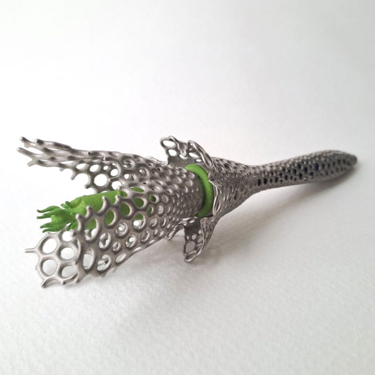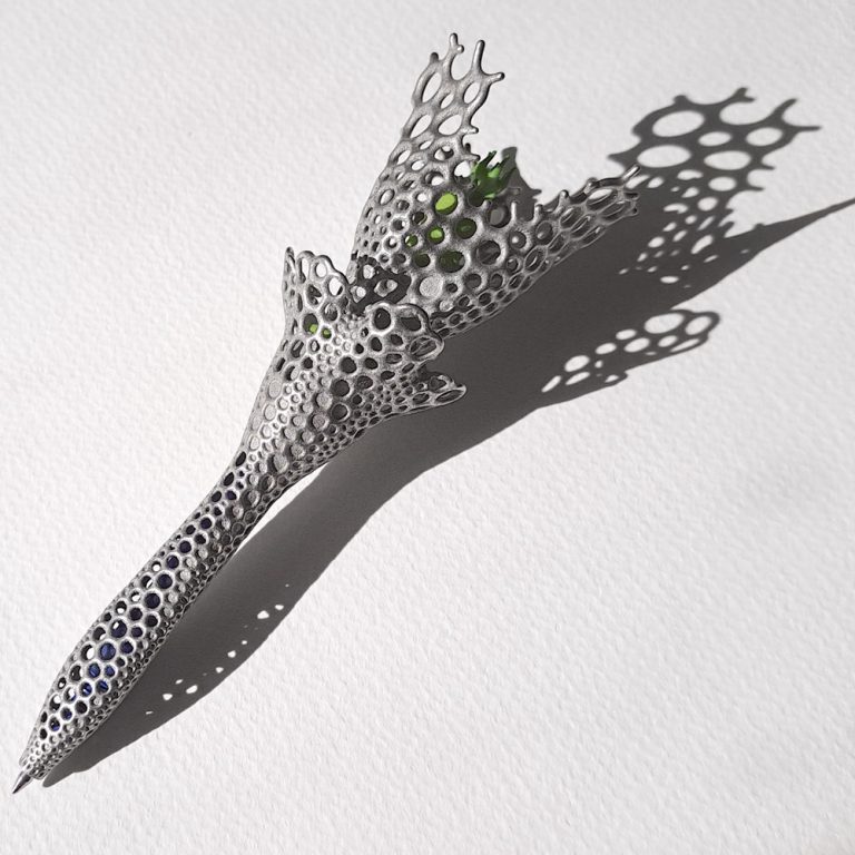 A pen inspired by ocean-dwelling creatures like coral, radiolaria, and crinoids, which is pleasing to write with, but also forms an aesthetic and unusual object which might have been found at the bottom of some ocean trench. I first modelled the overall shape and twist-extension mechanism in Rhino, and then developed a parametric Grasshopper script that combined remeshing, differential growth, and dual mesh algorithms to convert the outer form into an organic and frilly lattice, resembling illustrations of radiolaria by Haeckel. After printing, plastic parts were dyed green for a more biological appearance