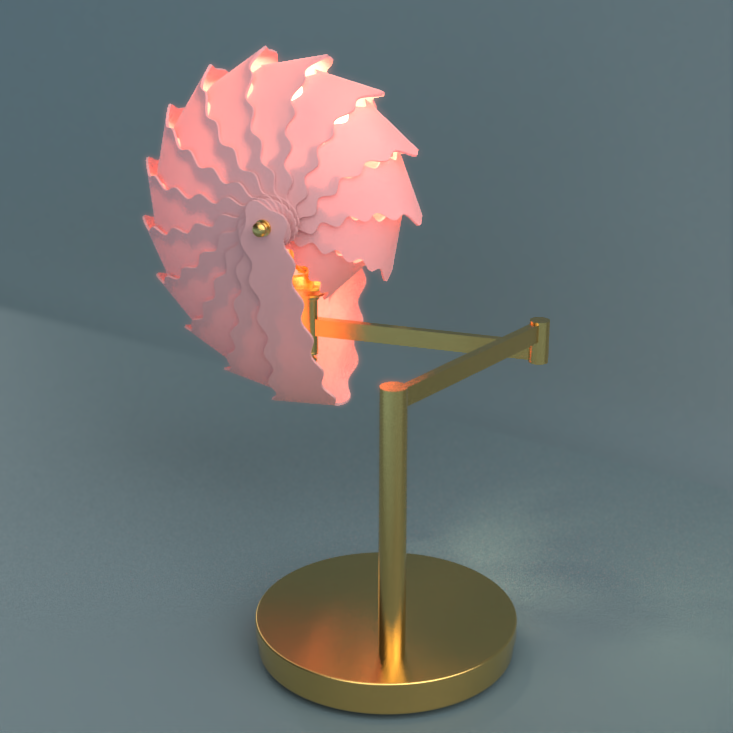A lampshade constructed from variegated paper slats. The number, width, and waviness of the slats can all be adjusted