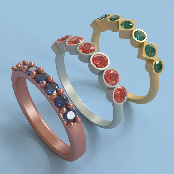 A set of rings with different combinations of stones and settings. Modelling these using a parametric script allows the designs to be updated or resized very easily
